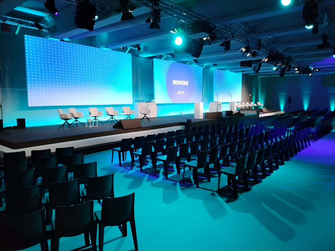 Pour une convention, un séminaire, une conférence ou une assemblée annuelle, nous créons des espaces fonctionnels où tout s’enchaîne naturellement : zone plénière, stands, circulation, accueil, scène, technique, mobilier, éclairage.